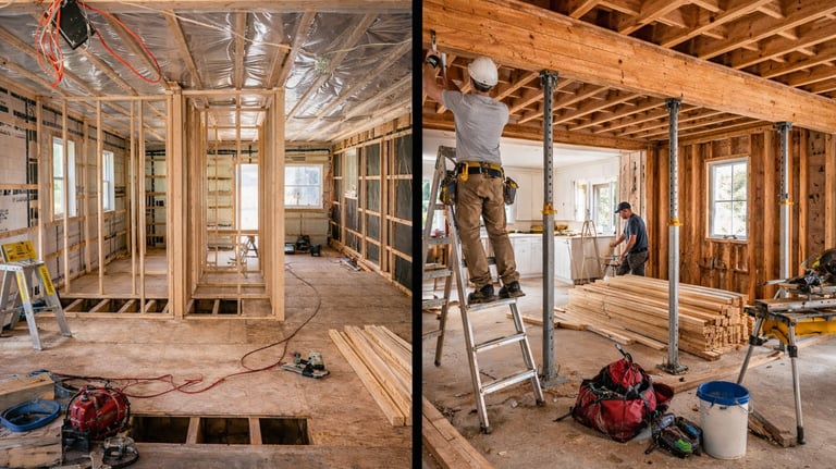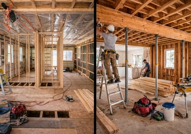 Travaux de structure et charpente pour maisons, garages et agrandissement. Ossature solide et durable, conçue selon les normes et l'architecture existante.
